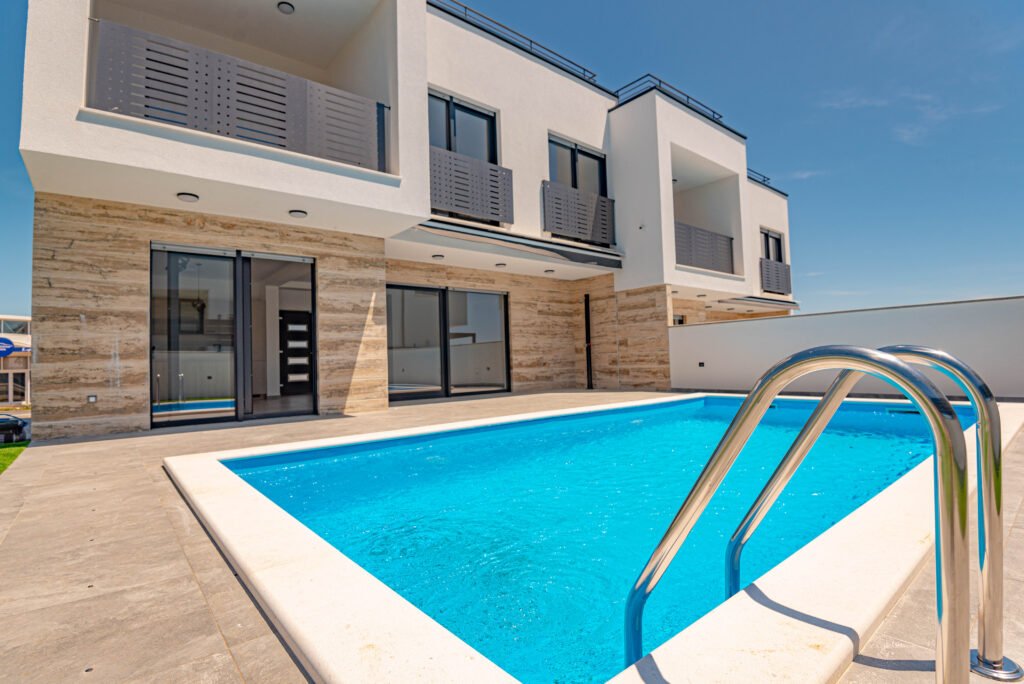 Die Villa Anker gehört zu einer neuen Überbauung von insgesamt vier Villen am Rande von Vodice. Die Villen befinden sich 1600m vom Strand und 1300m vom Stadtzentrum entfernt. Damit bieten sie die richtige Balance zwischen Ruhe und Aktivität. Sie verfügen über Meerblick und sind hochwertig ausgebaut. Die Villa “A” hat eine Wohnfläche von insgesamt 140 m2, verteilt auf zwei Etagen. Das Erdgeschoss besteht aus einer Küche mit Ess- und Wohnzimmer, Flur, Abstellraum und Gästetoilette. Das 1.OG beherbergt drei Schlafzimmer und zwei Badezimmer. Die Villa verfügt über eine grosszügige Dachterrasse mit einer Fläche von 52m2. Diese bietet die Möglichkeit für ein Sonnendeck und ist für einen eventuellen Whirlpool vorbereitet. Der Garten ist komplett eingezäunt und hat eine Fläche von 200m2 inklusive eines geräumigen Parkplatzes, Grillplatz im Freien und einem 22m grossem Pool. Verpassen Sie diese Gelegenheit auf keinen Fall und nehmen Sie so bald wie möglich mit uns Kontakt auf, denn falls Sie die Villa gerade nicht privat nutzen, können Sie ihre Investition auch über airbnb oder Booking amortisieren, denn die Immobilienvermietung an Touristen boomt in Kroatien.